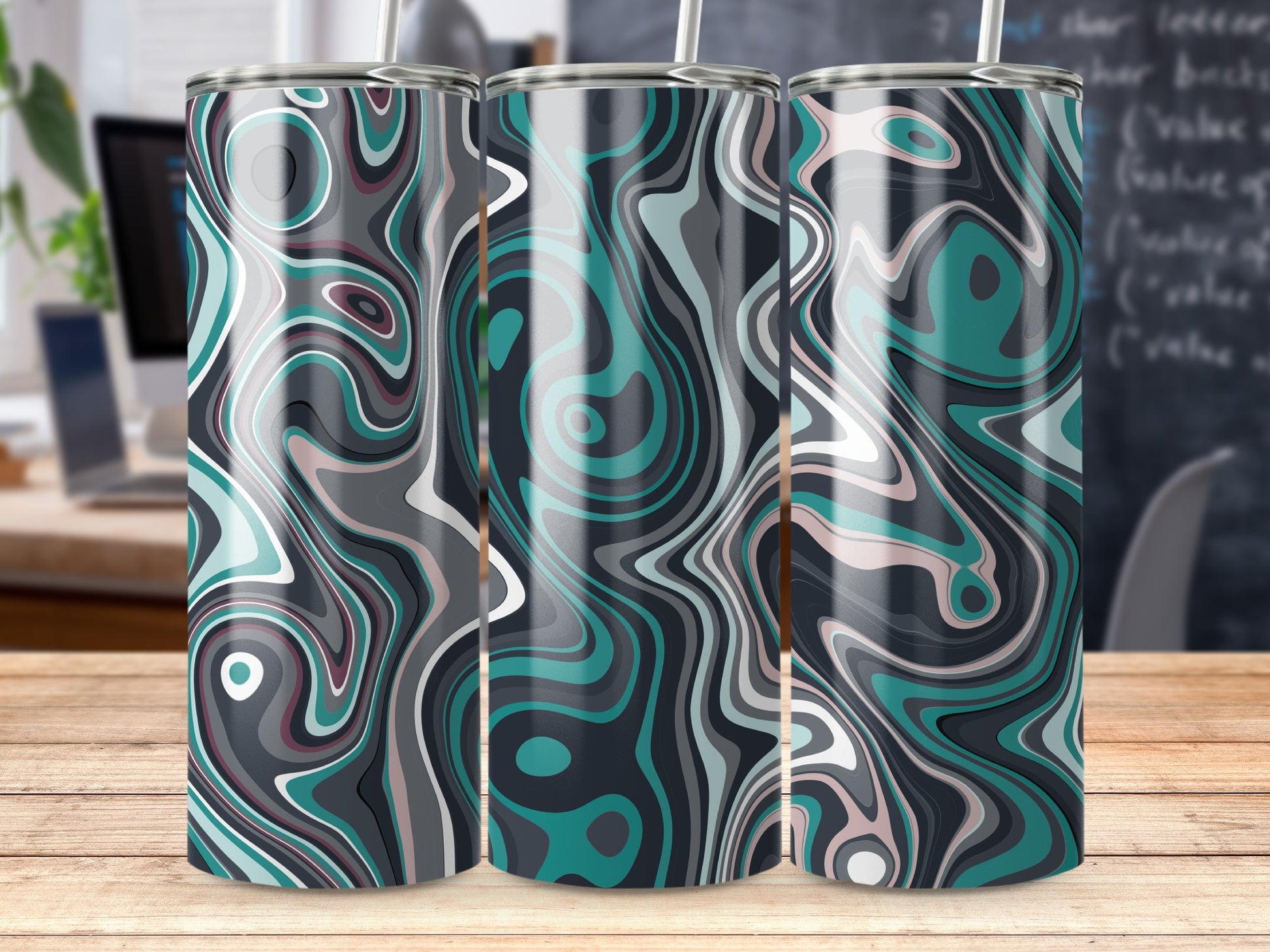 Experience the tranquil charm with our Abstract Swirls Tumblers featuring captivating aqua and grey hues. This mesmerizing design brings a serene artistic expression to every sip you take.