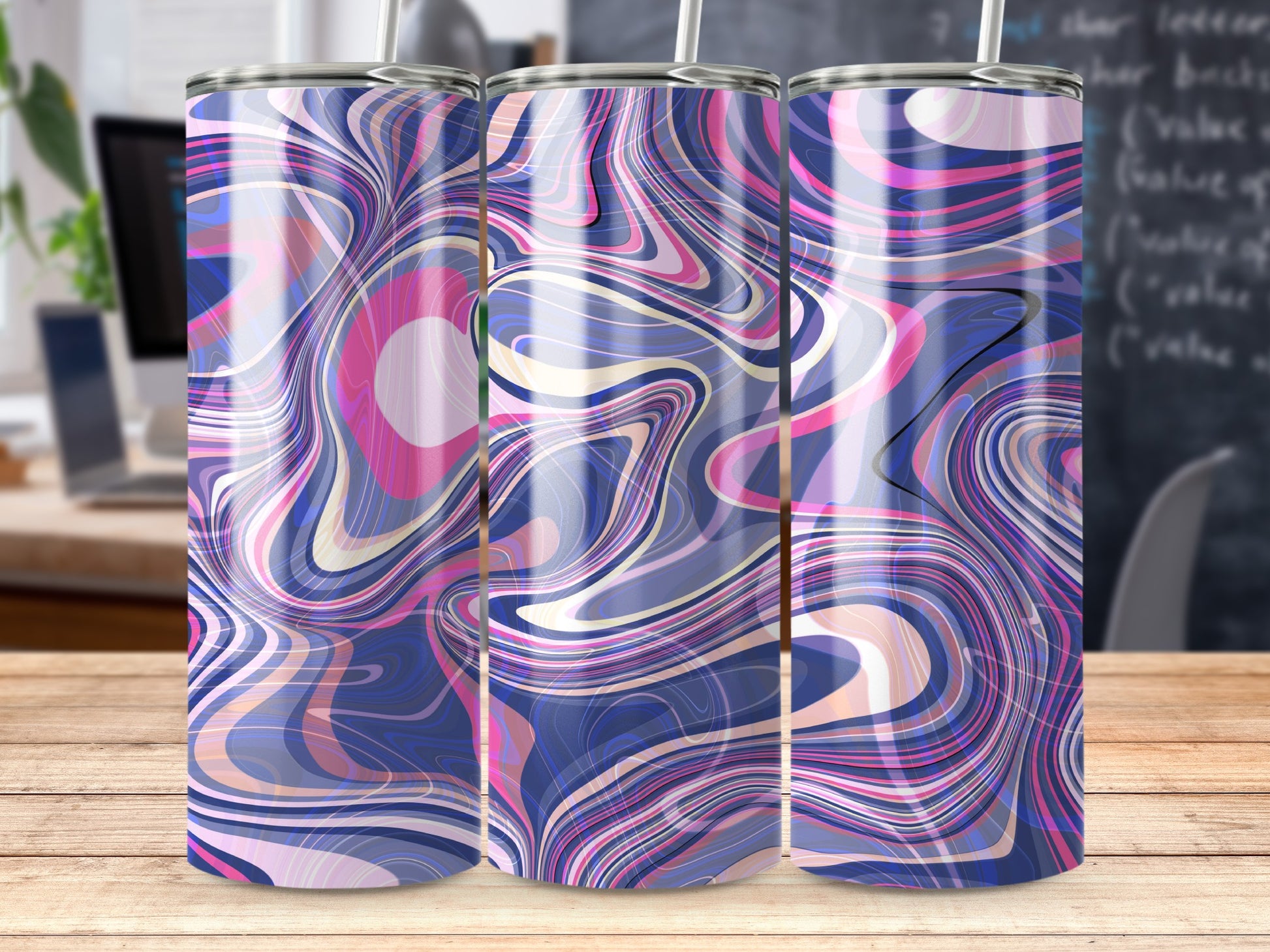 Dive into a mesmerizing world of color with our abstract swirl tumblers. A blend of pink blue and white hues creates an artistic masterpiece that will elevate your daily hydration. Perfect for anyone.