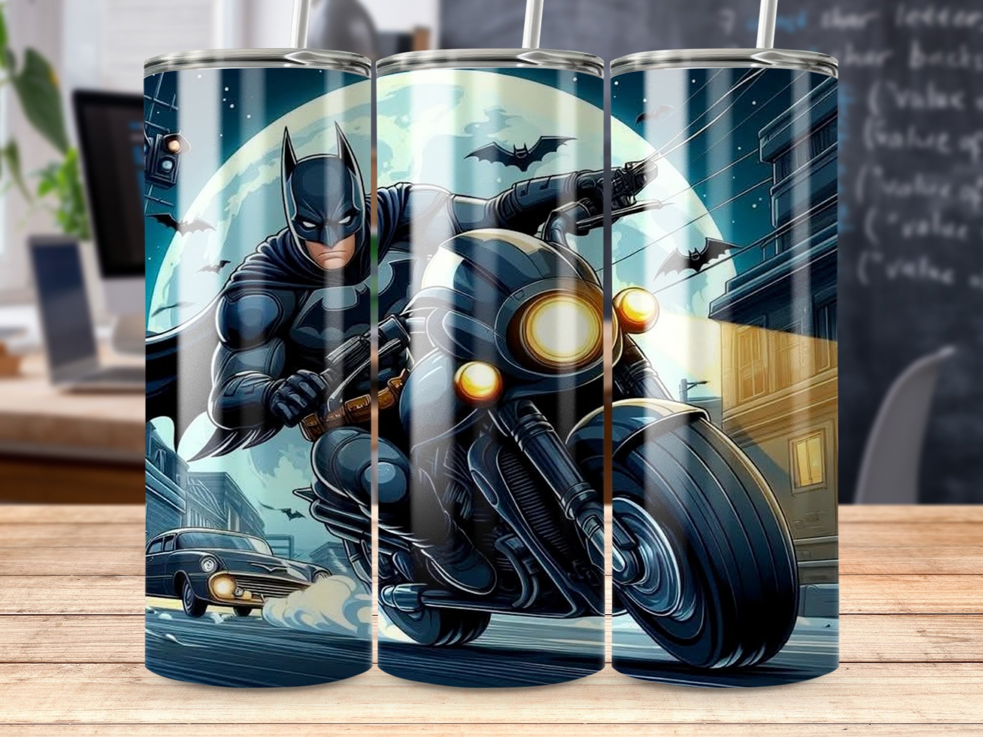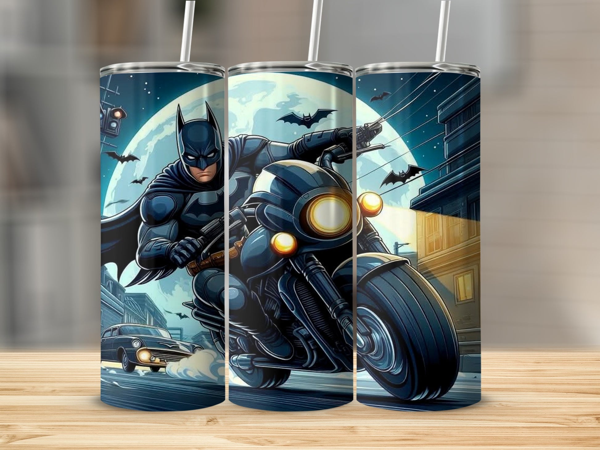 Batman on a Motorcycle Night Scene Illustration Tumblers
