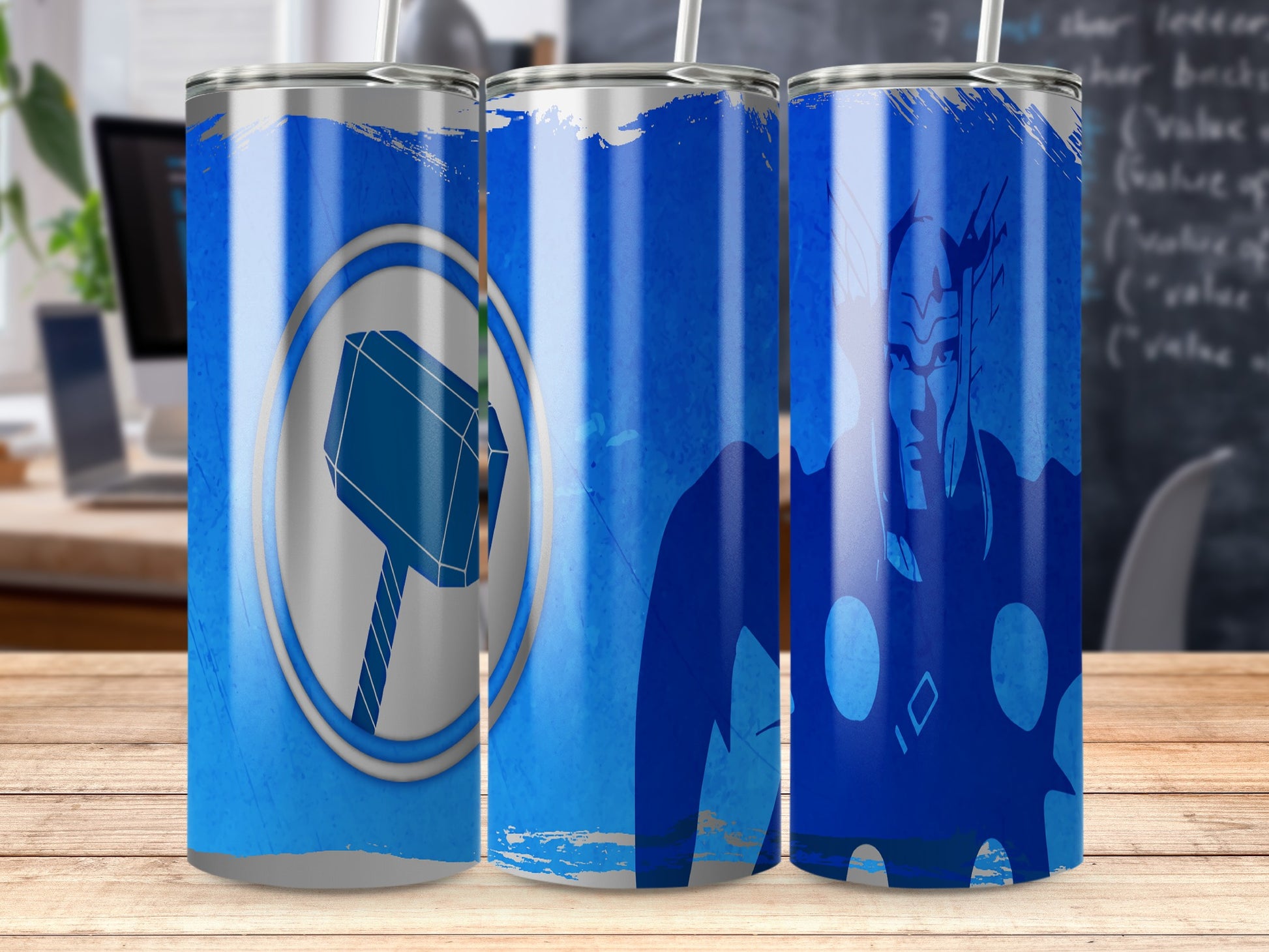 Show your love for the heroic God of Thunder with this tumbler! It features a cool hammer emblem and a Thor character graphic in a dynamic blue design. A perfect gift for all superhero fans.
