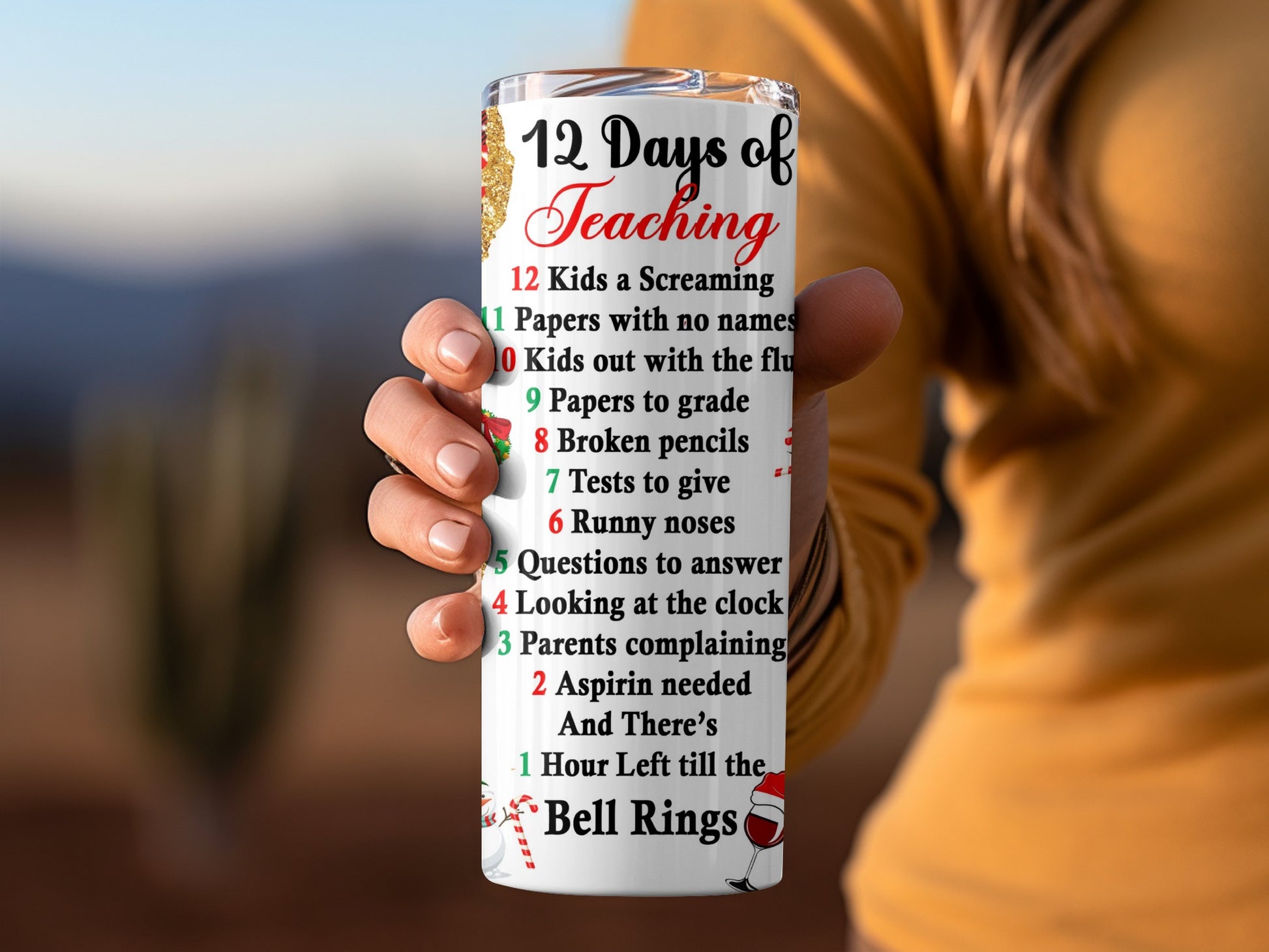 Celebrate the end of the school year with this 12 Days of Teaching tumbler. Featuring a festive holiday design with a funny teacher quote. A perfect gift for any teacher.