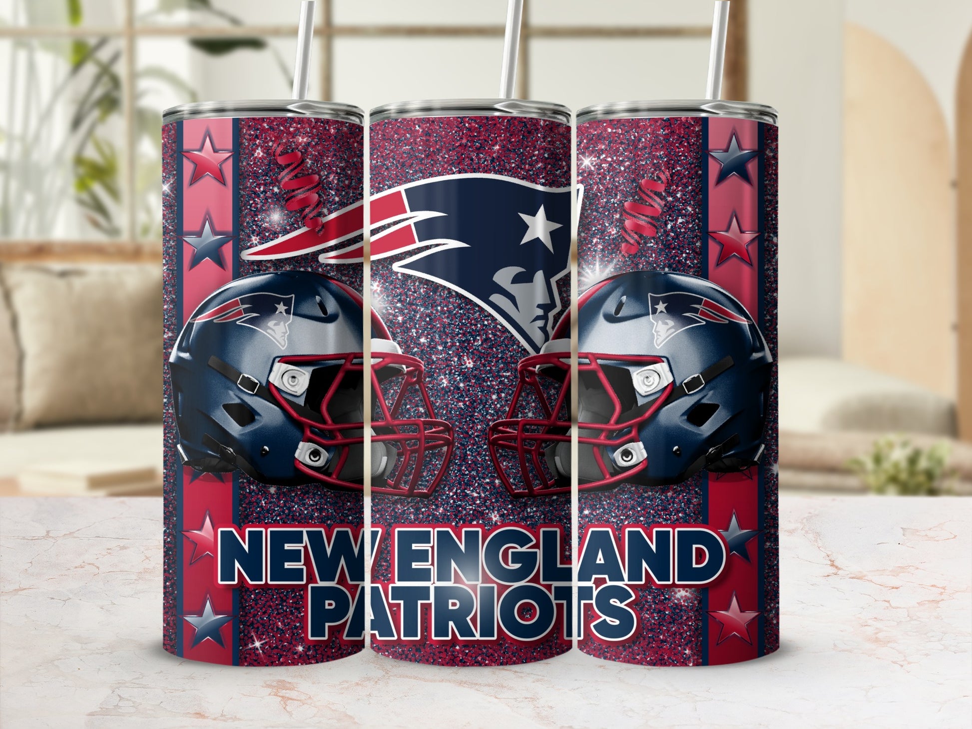 Show your Patriots pride with this unique tumbler. Featuring helmets logo stars and glitter. Perfect for game day everyday use show off your team spirit everywhere you go.