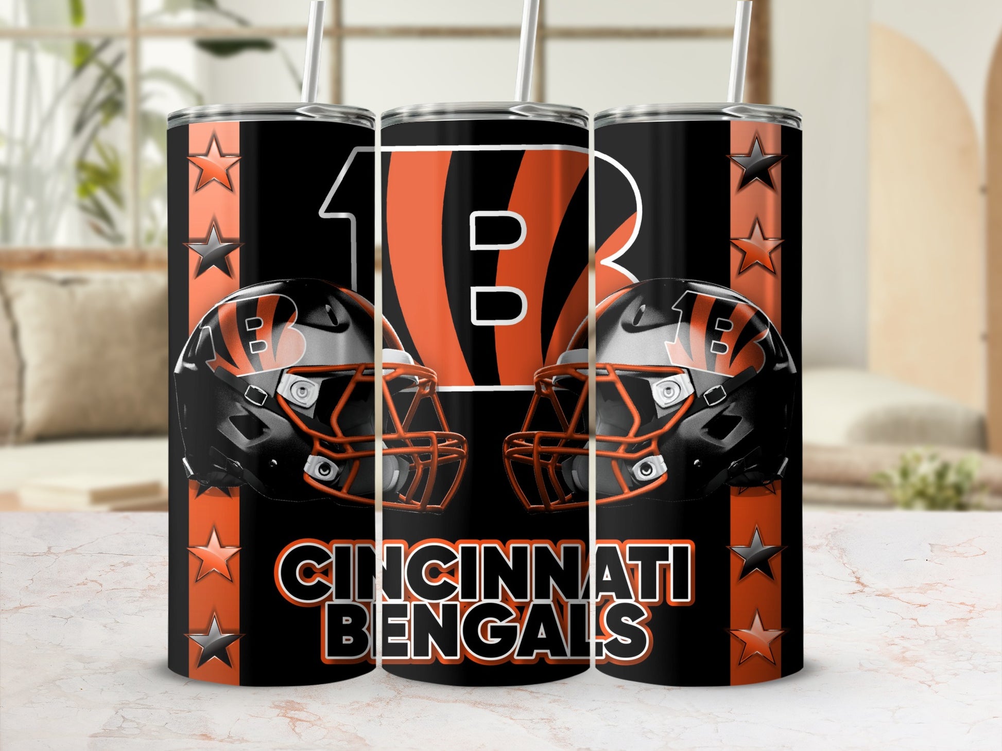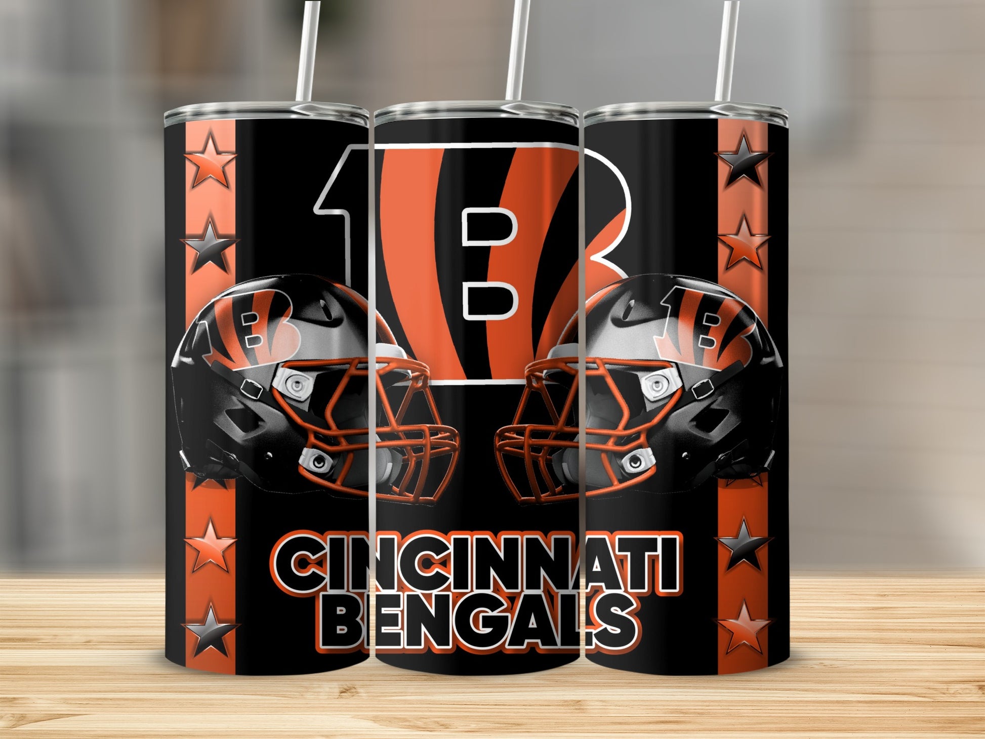 Show your team spirit with this Cincinnati Bengals themed tumbler! Featuring Bengals helmets in orange and black with team logo graphics and star accents. Perfect for game day!