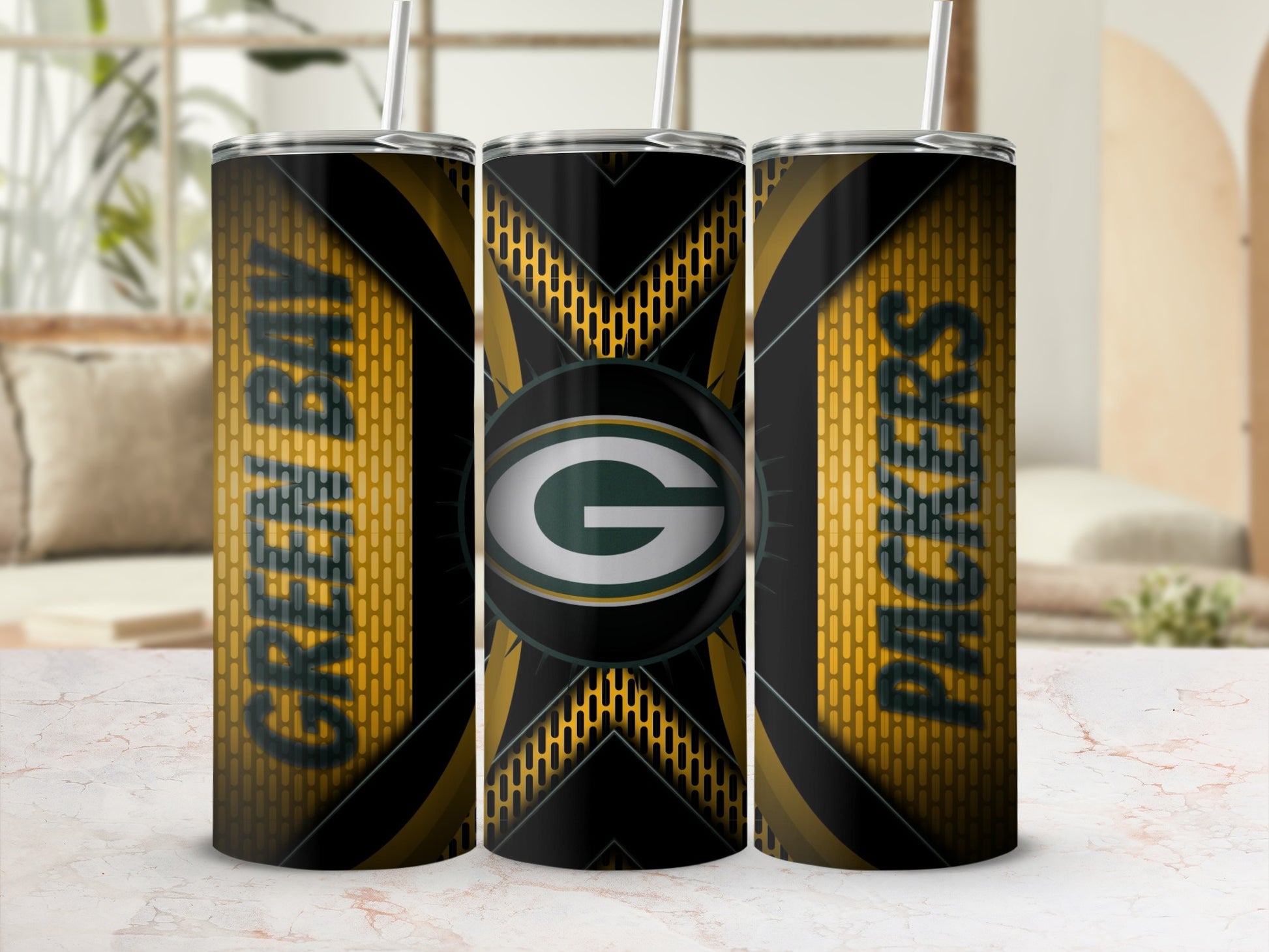 Show off team pride with this Green Bay Packers themed tumbler. Its unique design features the iconic logo against an abstract yellow grid pattern that is both stylish and eye catching.