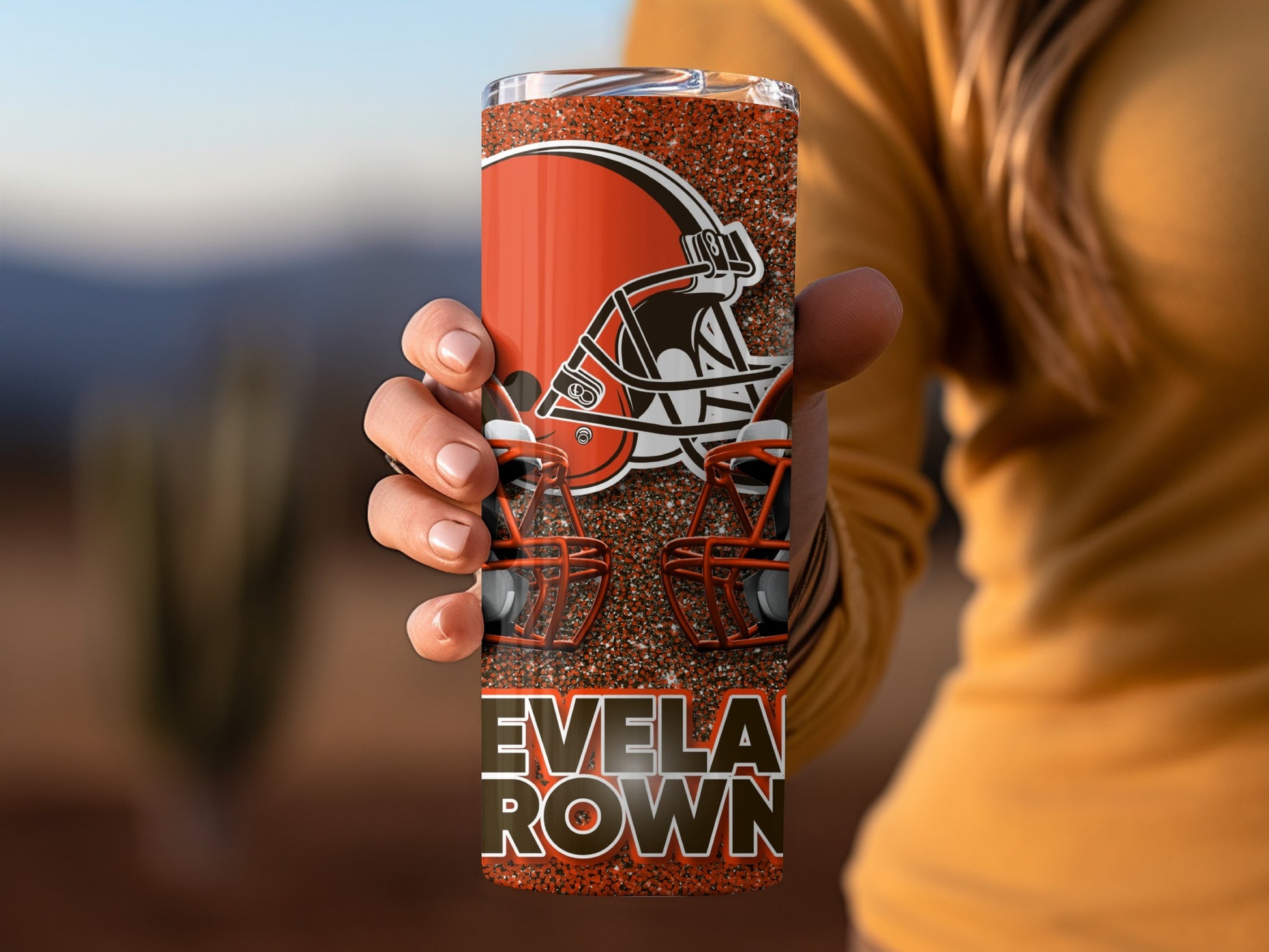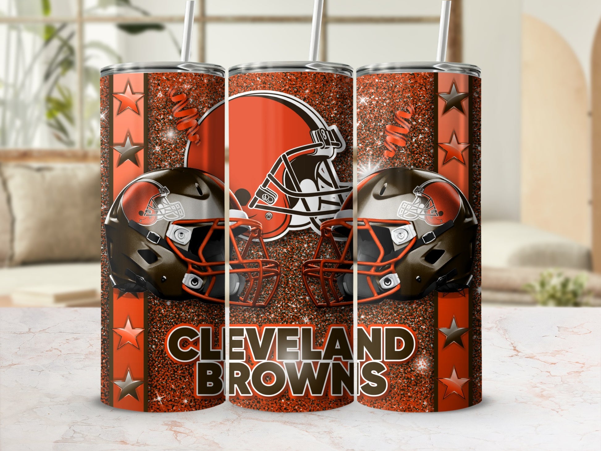 Show off your Cleveland Browns pride! Featuring Browns helmets against a glittering backdrop this unique tumbler is a perfect way to support your favorite NFL team. Get yours now!