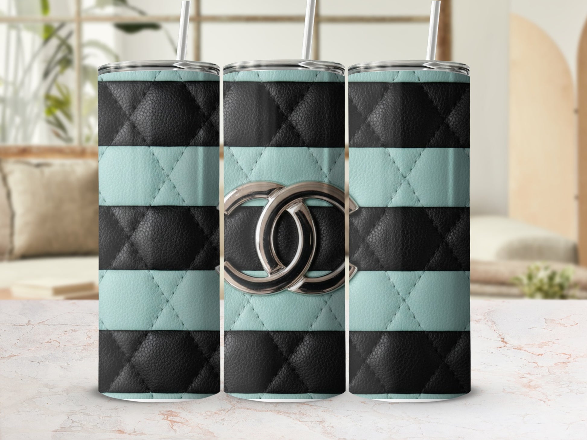 Elevate your drinkware with our black and mint design tumblers. The intricate pattern showcases a stylish logo detail perfect for adding sophistication to every beverage.