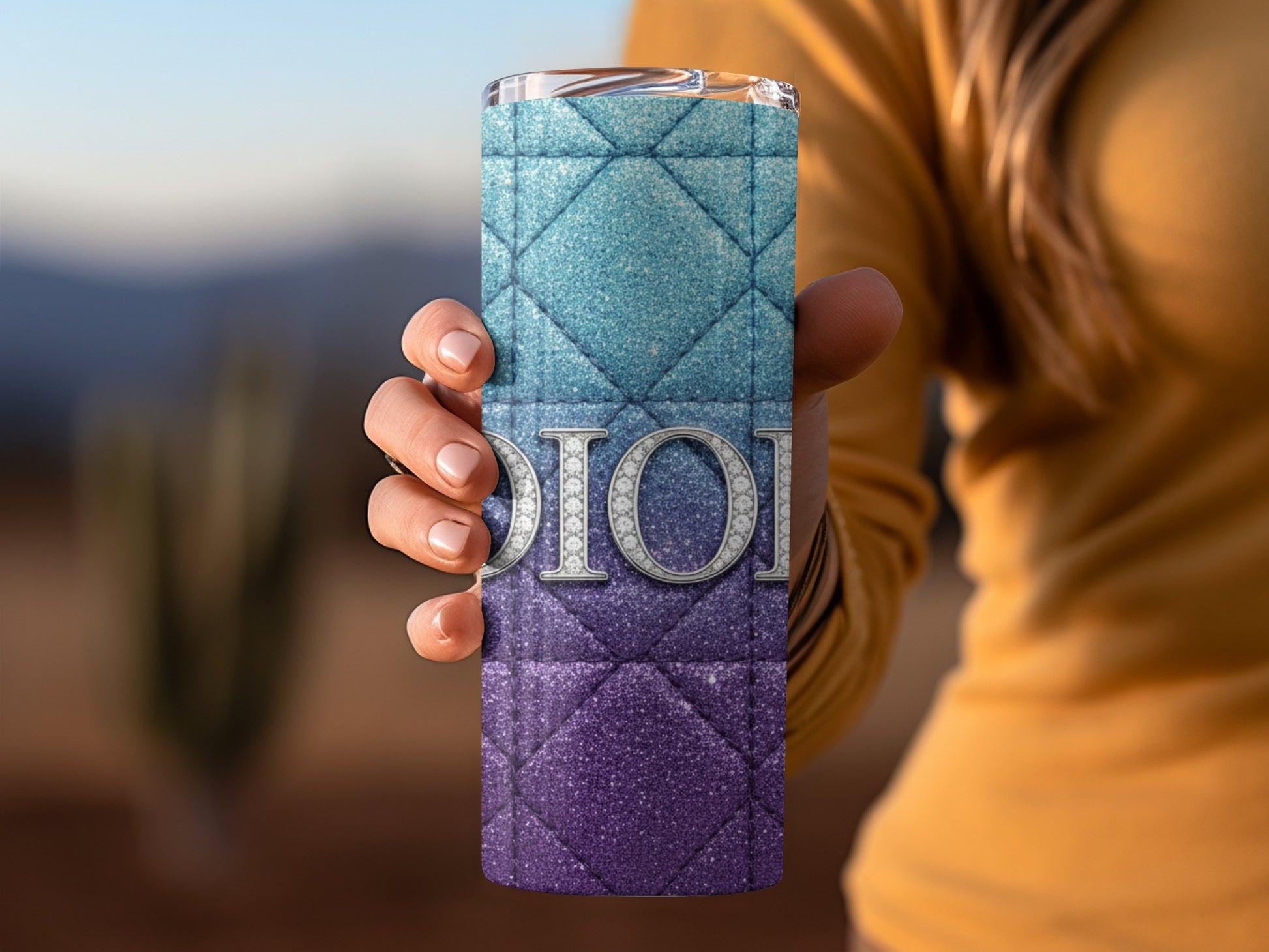 Sparkle your way through the day with this DIOR themed tumbler. Featuring a quilted gradient pattern from blue to purple with a silver DIOR logo. A fancy drinkware for any occasion.