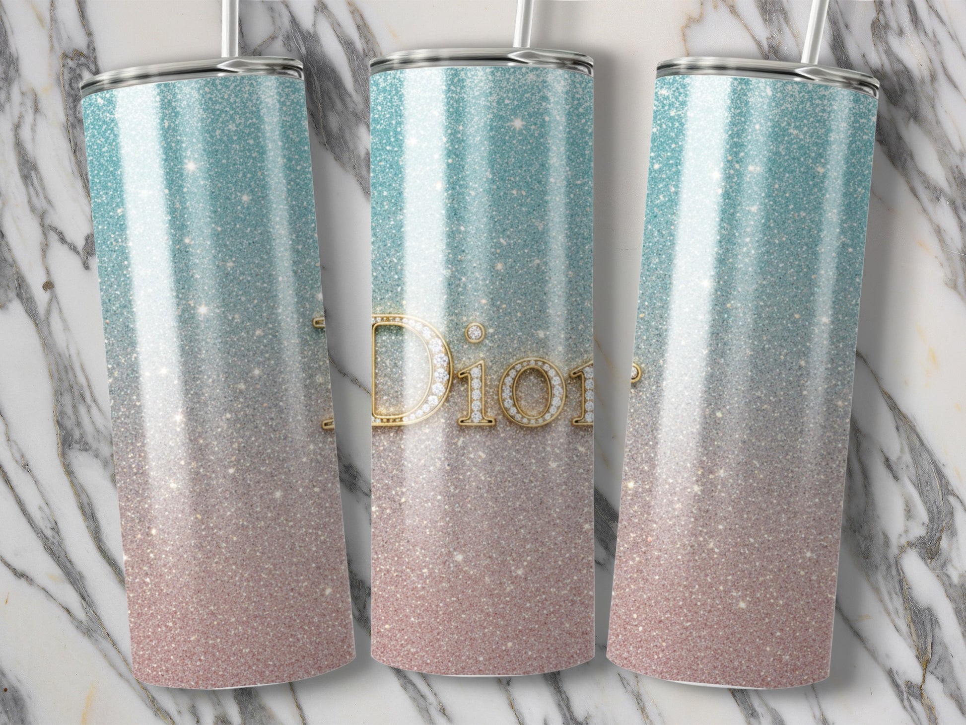Elevate your everyday style with this mesmerizing tumbler featuring the iconic Dior logo in shimmering gold against a stunning gradient backdrop. Make your hydration routine sparkle.