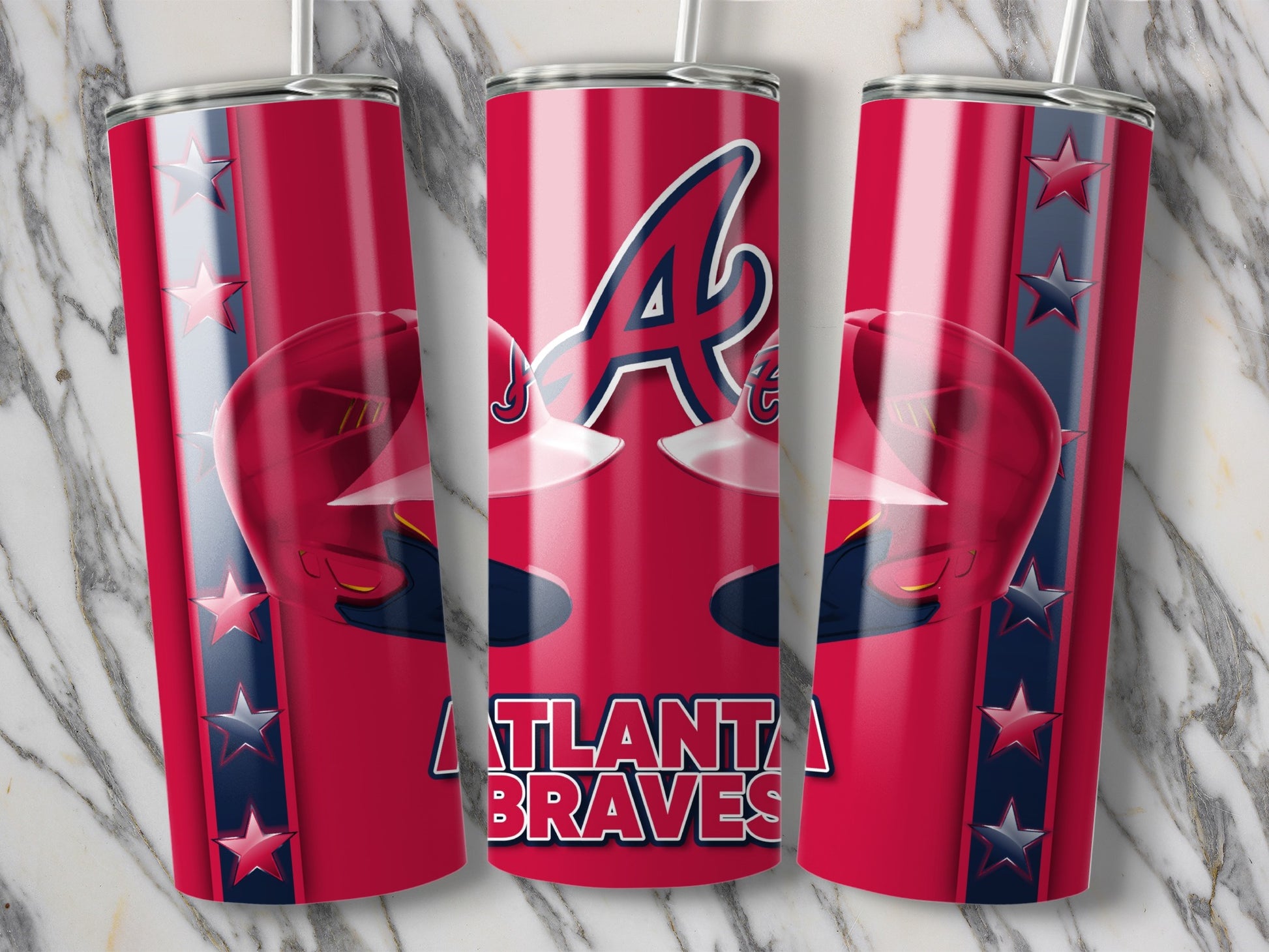 Show your support for the Atlanta Braves with this vibrant Tumblers design featuring helmets and the team logo. Perfect for any baseball fan looking to express their team spirit.