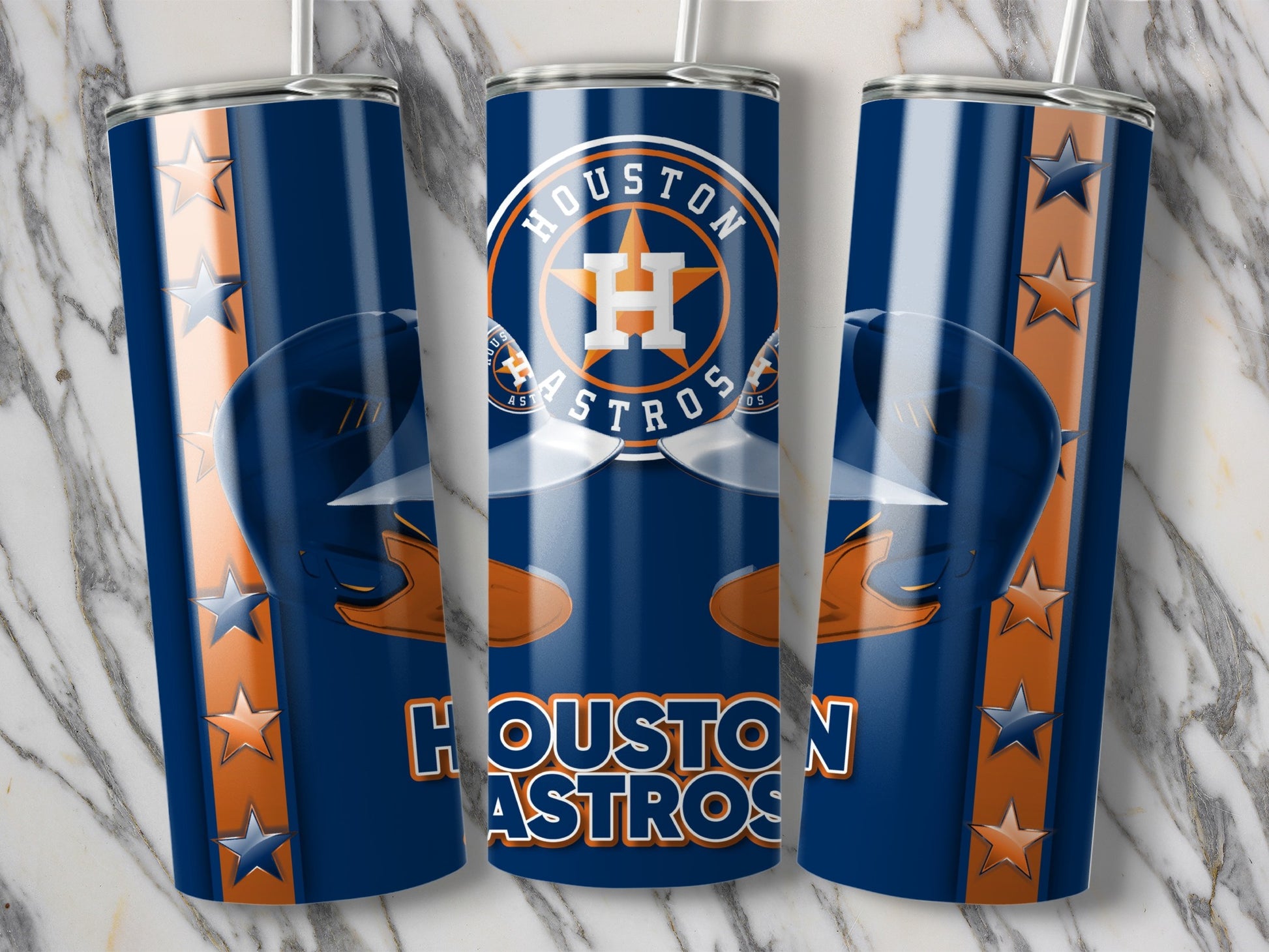 Celebrate your love for baseball with this Houston Astros themed tumbler. Featuring vibrant team colors helmets and the iconic logo this tumbler is a perfect way for a fan to enjoy.