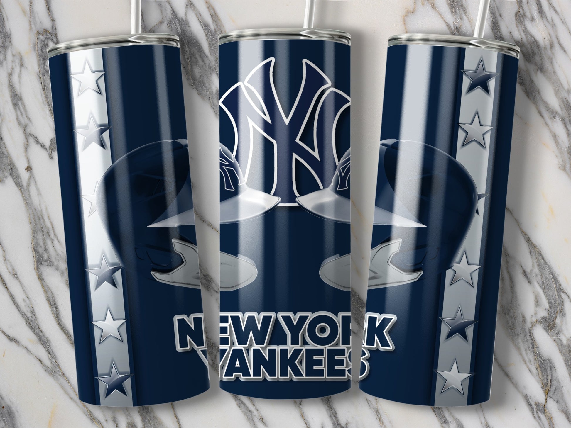 Show your Yankees pride with these unique tumblers! Featuring baseball helmets and the iconic New York Yankees logo on a blue starry background. Perfect for any fan.