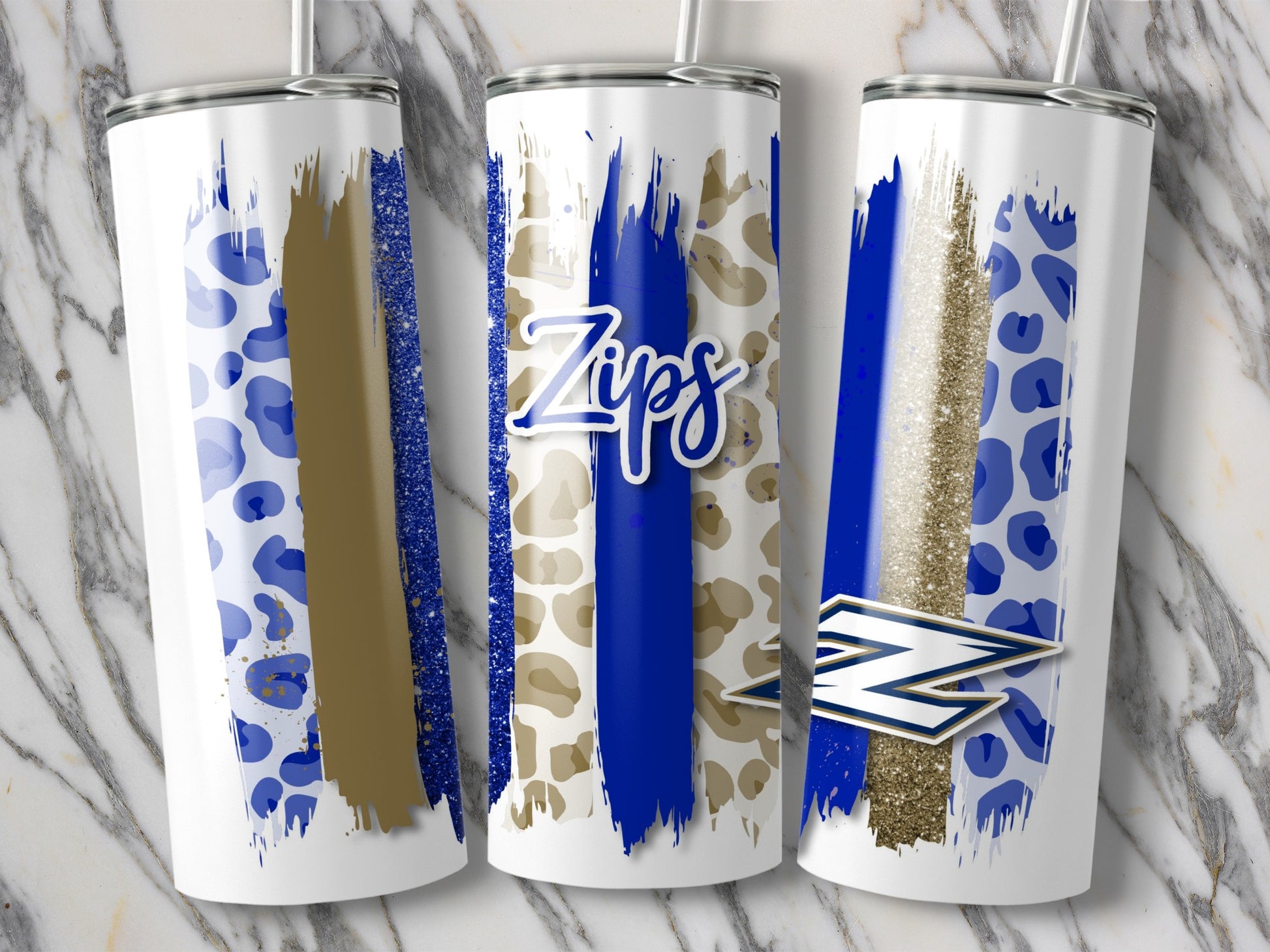 Show your Zips spirit with this unique tumblers design! This design features brush strokes in various patterns and textures, including leopard print and glitter. Perfect for students, alumni, and fans. A great way to show your college pride.