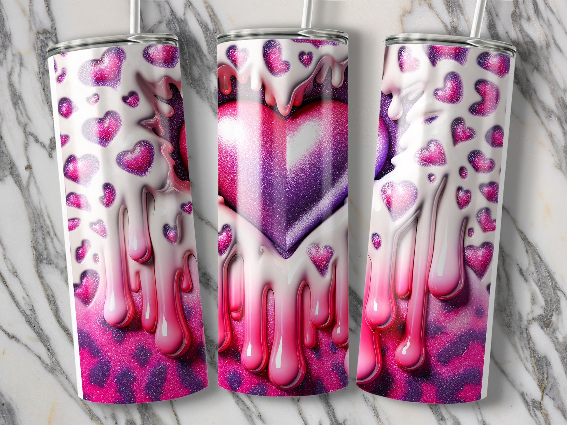 Show your love with this vibrant heart tumbler, perfect for Valentine's Day or any day you want to express affection. The design features a large, striking heart melting into a sweet, dreamy scene of pinks and purples, surrounded by smaller glittery hearts. These tumblers are a unique and thoughtful gift.
