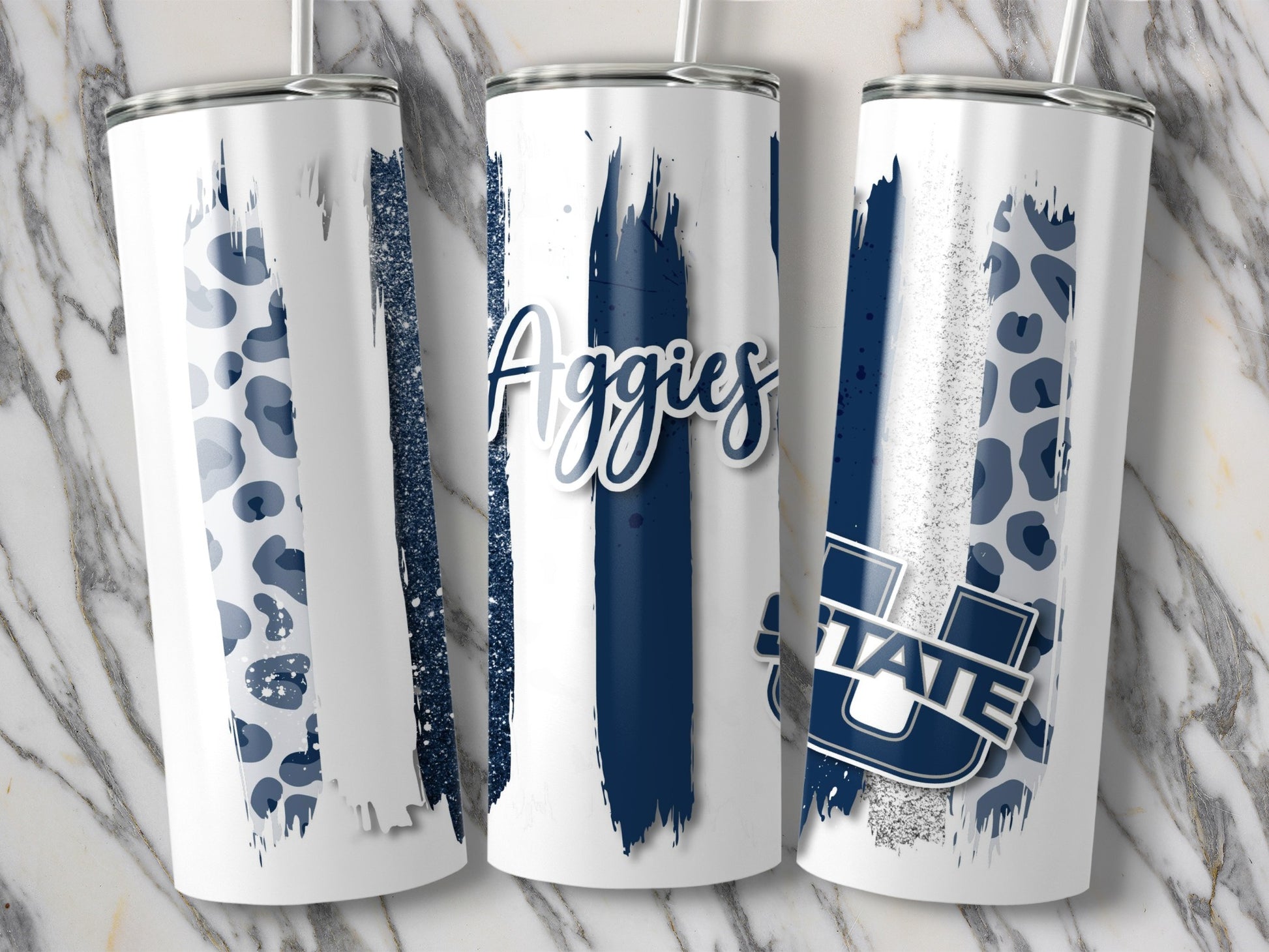 Show your Aggies pride with this unique Tumblers design. Featuring brushstroke elements and a touch of leopard print with glitter, this design is a stylish way to represent Utah State.