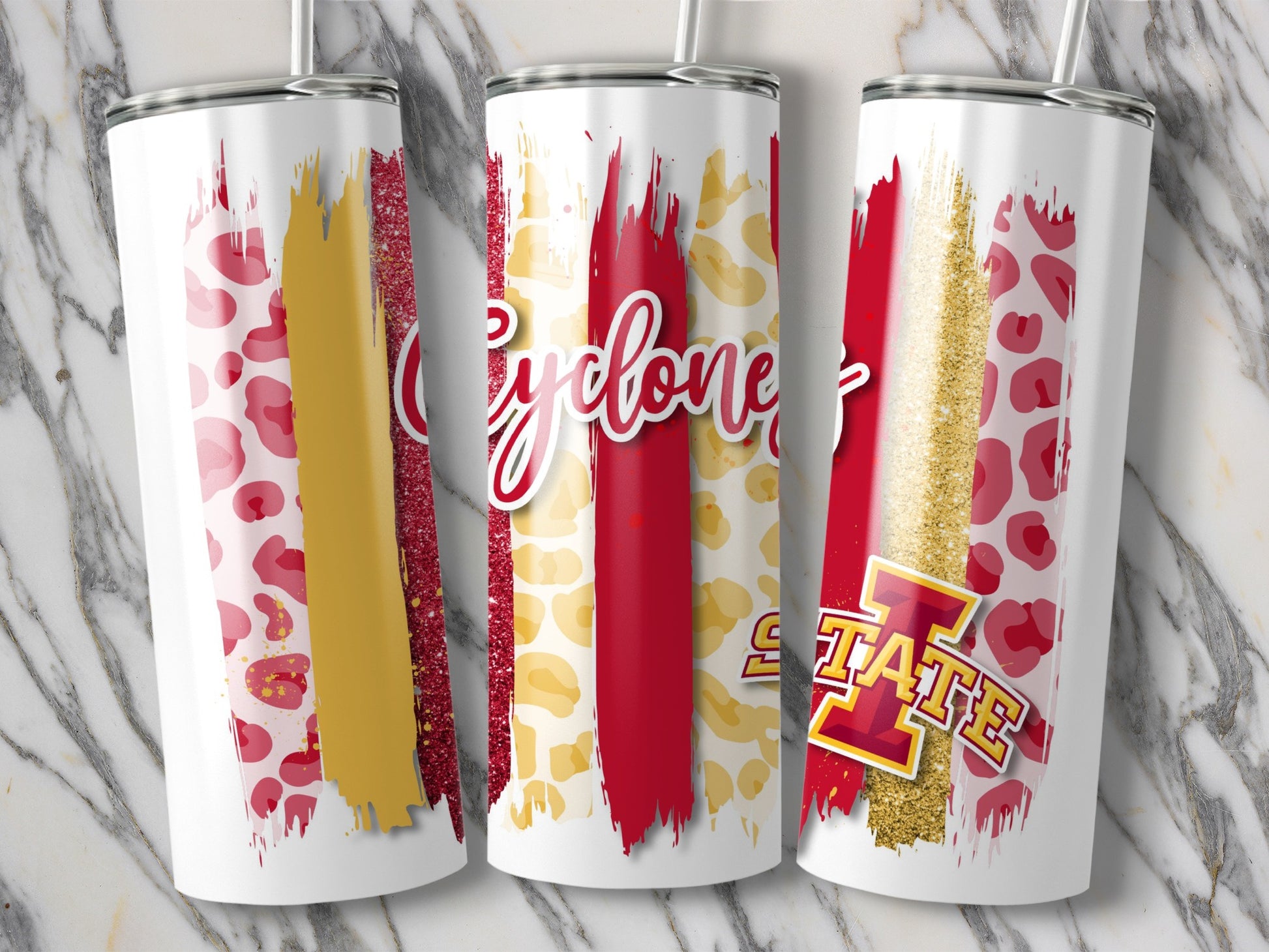 Show your team spirit with these unique Cyclones Tumblers, perfect for any Iowa State University fan. The vibrant design features brush strokes in team colors, combined with trendy leopard print and a touch of glitter.