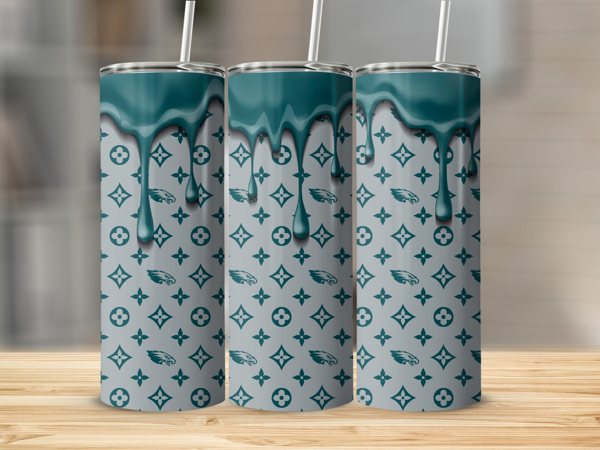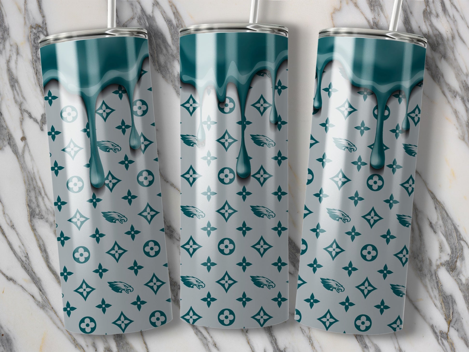 Show your team spirit with this unique tumbler featuring a Philadelphia Eagles inspired design. The bold teal drip effect adds a modern edge to the classic monogram pattern, making it a stylish accessory for any sports enthusiast.