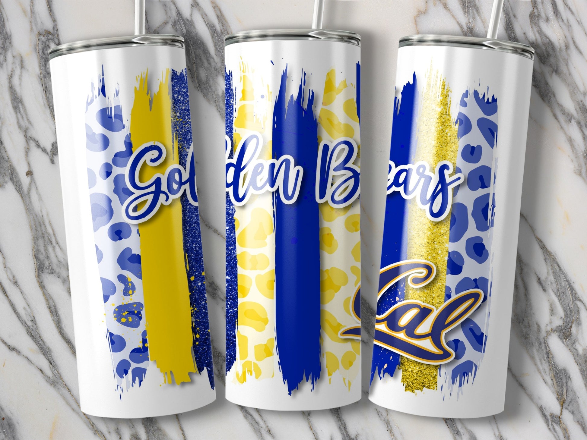 These tumblers feature a unique design with brushstroke stripes in blue, gold, and glitter, along with the Golden Bears logo and "Cal".