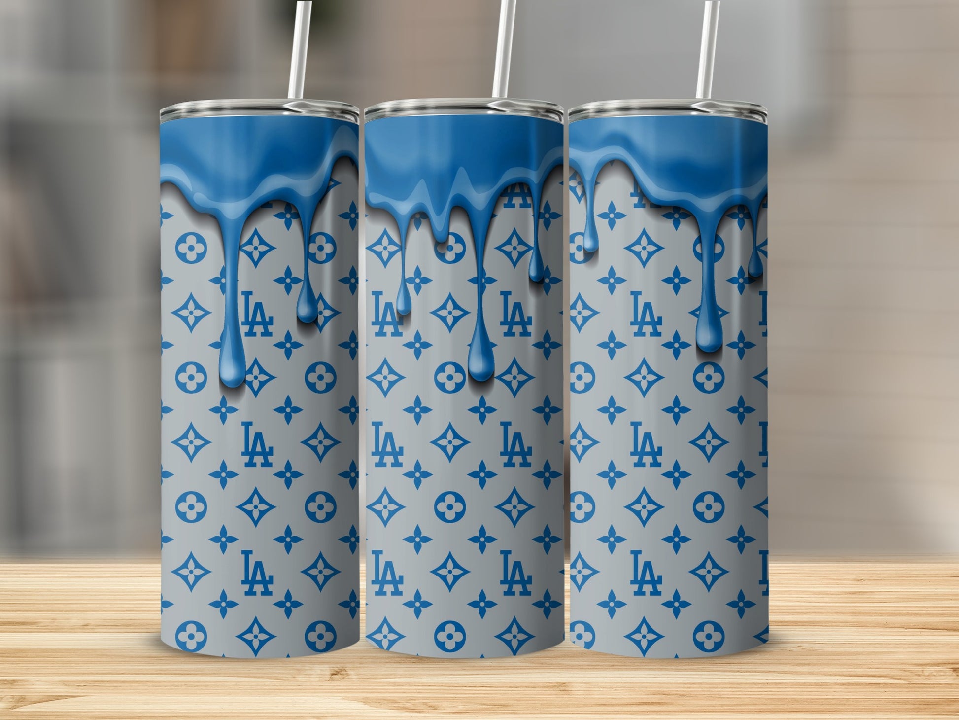 Show off your love for LA with these unique tumblers. Featuring a stylish dripping blue design over a Dodgers-inspired pattern, these tumblers are sure to turn heads.