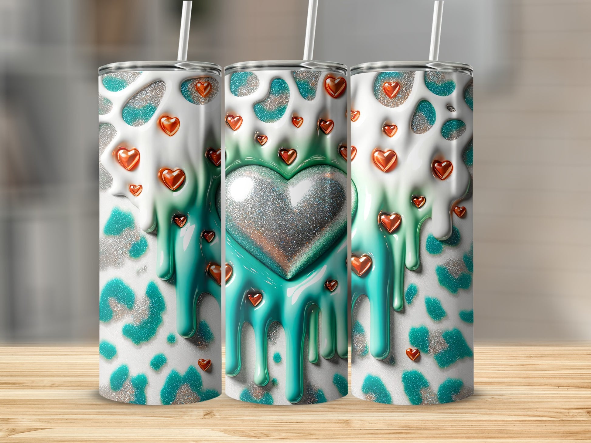 Discover the allure of our Turquoise Drip Tumblers featuring a captivating design with golden hearts and a central silver heart. This enchanting tumbler will surely make you stand out.